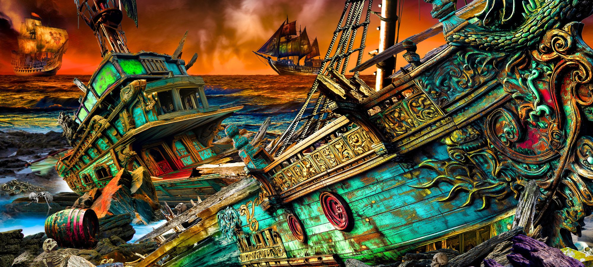 Across a sea that bleeds and under a darkening sky, there she lies..her gold and emerald body, fractured and still. You drift toward her, but the closer you get, the more you see — and the more you taste the sharp tang of dread. Where masts have splintered, and sails have torn, a graveyard surrounds what was once a jewel. Did she run aground by accident, her treasures left for the taking? Or was she placed there by something else...something that wants you for itself?